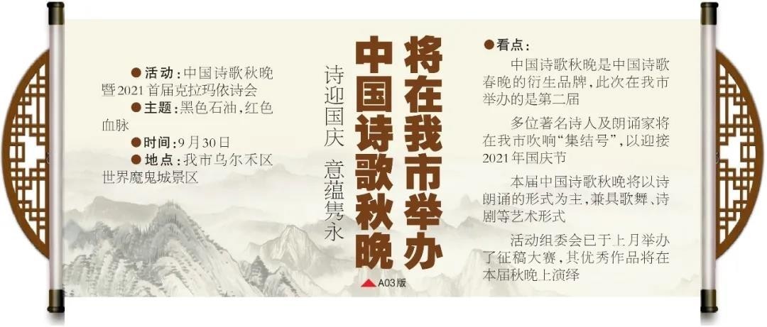 为表达对祖国、对家乡的大爱情怀,生动展现克拉玛依经济高质量发展成就和克拉玛依市民追求幸福生活努力奋斗的精神风貌,9月30日,我市将在世界魔鬼城景区举办“黑色石油,红色血脉”中国诗歌秋晚暨2021首届克拉玛依诗会。届时,多位著名诗人及朗诵家将在我市吹响“集结号”,以诗朗诵的形式迎接2021年国庆节,为中国共产党建党100周年献礼。本次活动由市委宣传部主办,市文联、市文体旅游局、克拉玛依广播电视台、克拉玛依日报社协办,中国诗歌春晚组委会、乌尔禾区委宣传部、乌尔禾区文体旅游局、乌尔禾区诗词协会承办。据悉,中国诗歌秋晚是中国诗歌春晚的衍生品牌。中国诗歌春晚创办于2015年,截至目前已举办7届,活动由教育部人文社会科学重点研究基地中国诗歌研究中心、中国诗歌研究中心朗诵艺术团、中国诗人、中诗网等100余家诗歌、文学、传媒机构联合举办,并在全球100余个城市设立了分会场。2020年,首届中国诗歌秋晚在浙江温州举办。